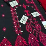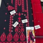 Crafted with premium lawn fabric, this black embroidered women 3 piece suit offers both comfort and durability, making it perfect for long festive days. The rich black base color beautifully contrasts with vibrant red embroidery, creating a bold and eye-catching look that enhances your overall appearance.